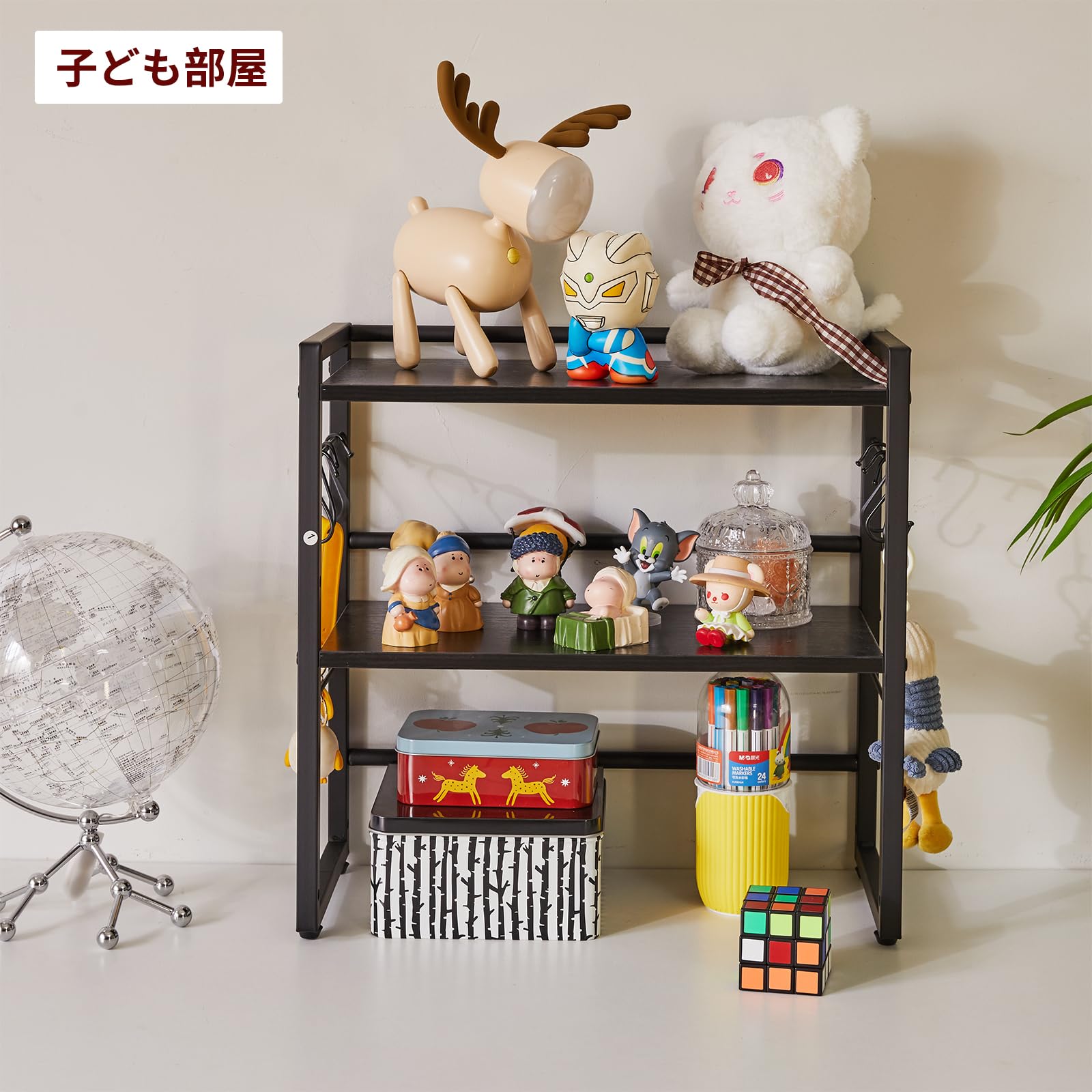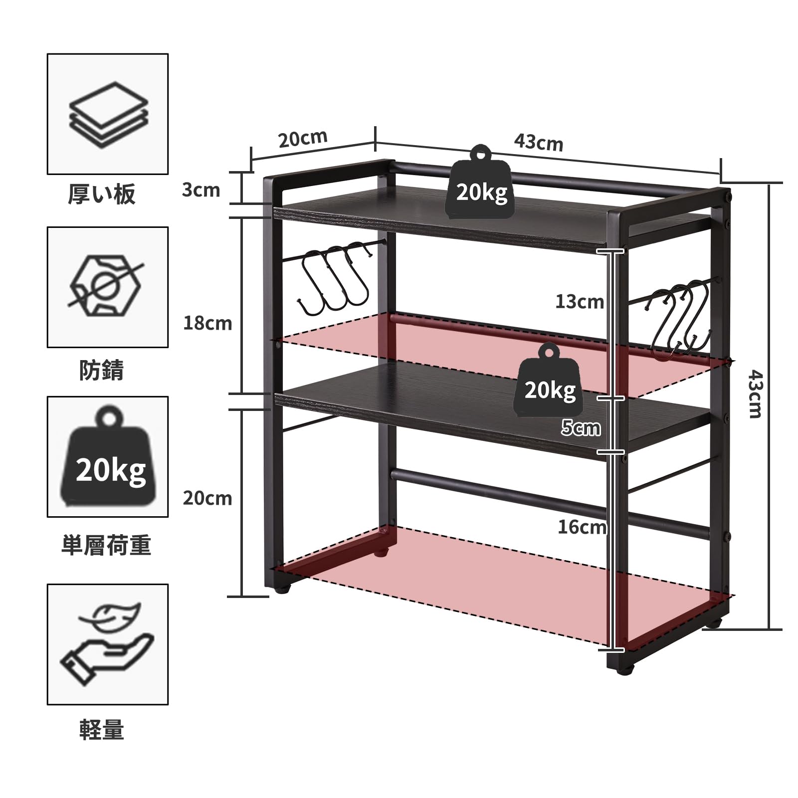 負荷能力:デスクシェルフのサイズは幅43×奥行20×高さ43cm、材料は鋼材とパーティクルボードです。組み立てが容易で、単層最大荷重は20kg。また、6つのフックが付属しており、イヤホンや鍵、皮むき器、栓抜きなどの小物を収納できます