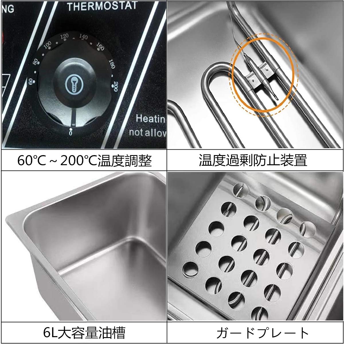 【温度調節】60℃〜200℃まで温度設定できます。温度過剰防止装置が付き、油温が設定した温度以上に上昇する場合は自動的に電気の供給を止まる。(設定温度を超えると自動的に電源が切れます、温度が下がると自動的に加熱されます。)