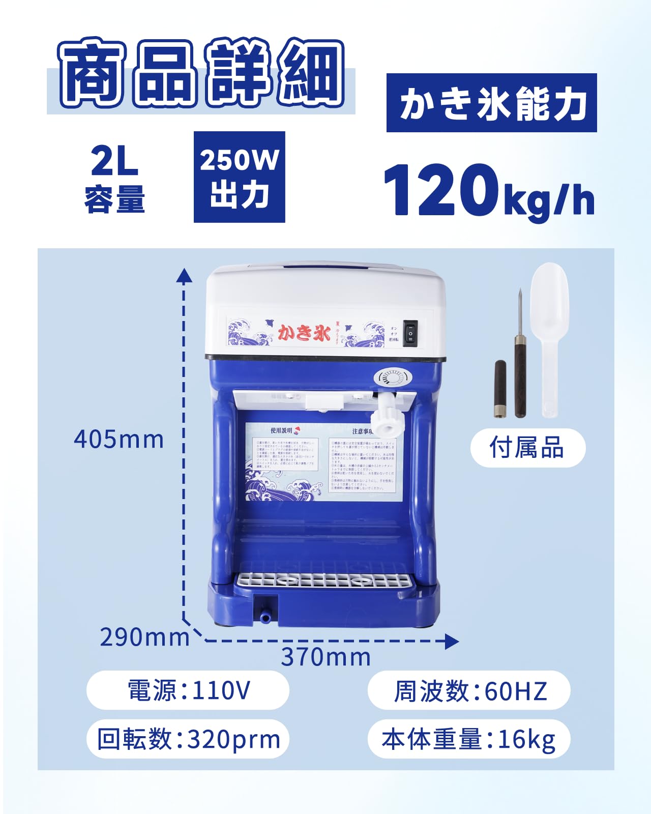 【業務用高速処理・120kg/h】250W高出力モーター搭載で、1時間あたり120kgの氷を高速砕氷!夏祭りや飲食店の繁忙期でも安定供給可能。従来機の2倍の効率で、待ち時間を大幅削減。