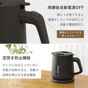 【1200Wハイパワー】1200Wのハイパワーで満水時(1L)でも約5分でお湯が沸かせ、コーヒーや紅茶など、飲みたいと思ったときにすぐお湯を沸かしてくれます。容量も1Lと大容量なので、家族みんなでのティータイムなどにも役立ちます。※沸騰時間は目安で、条件(室温・水温等)によって異なります。