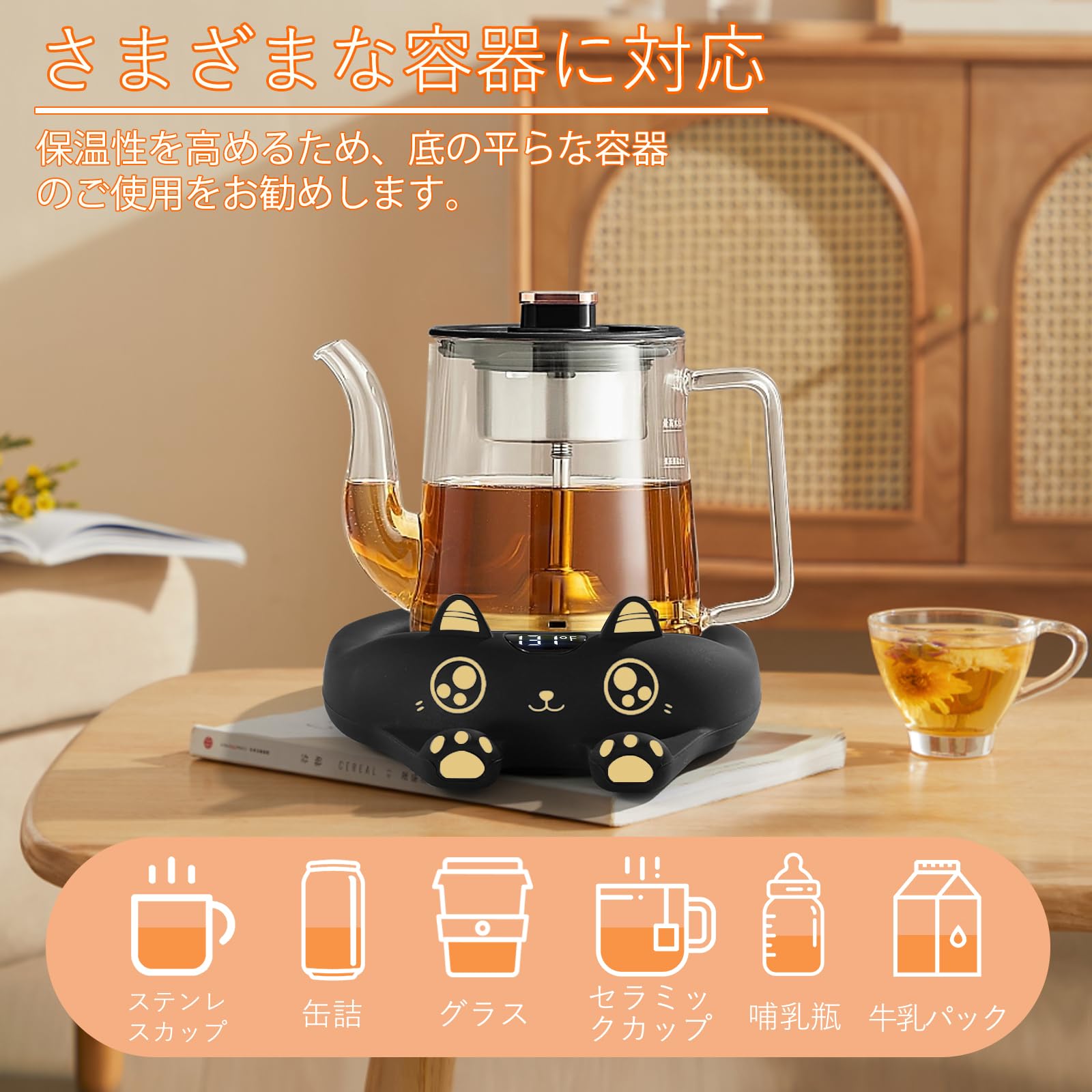 平底マグ用 - このデスク用コーヒーウォーマーは、セラミックカップ、ガラスカップ、ステンレススチールカップ、箱入りミルク、高温プラスチックカップなど、ほとんどの平底カップに適合します。平底のカップはより良い加熱結果が得られます。 (くぼみのない厚底カップ)